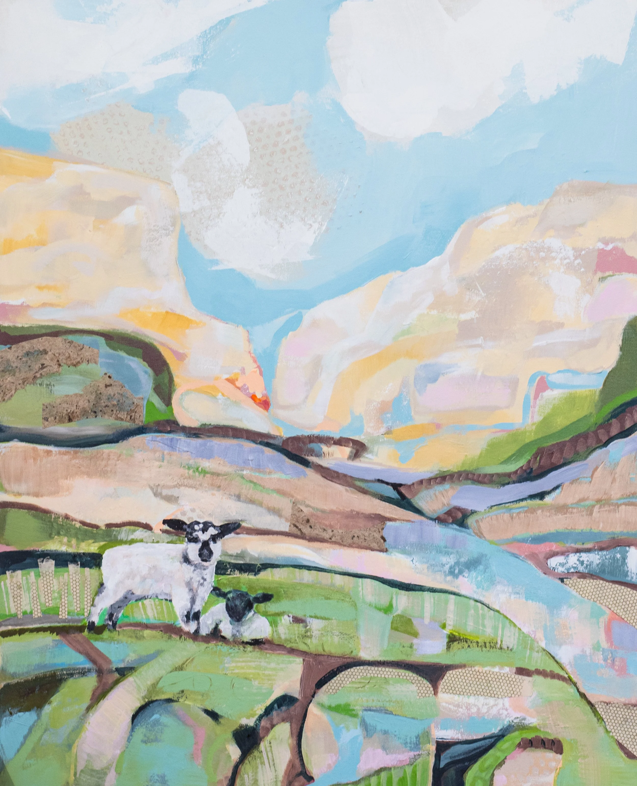 It is interesting to try to paint the rolling hills dotted with white sheep without making it look cartoonish. I challenged myself to experiment with unusual colors, textures and materials while celebrating the vibe of the Irish countryside.
